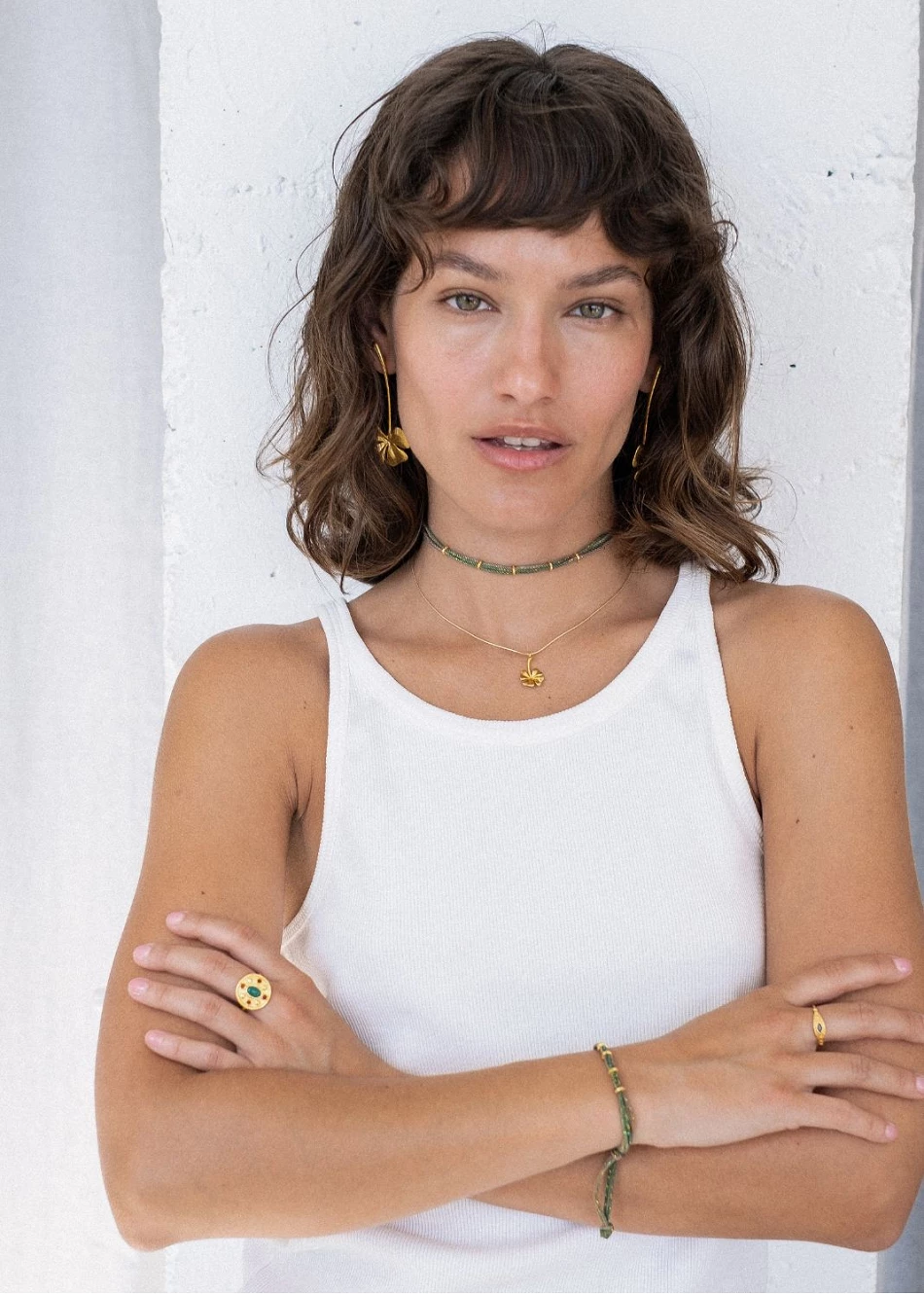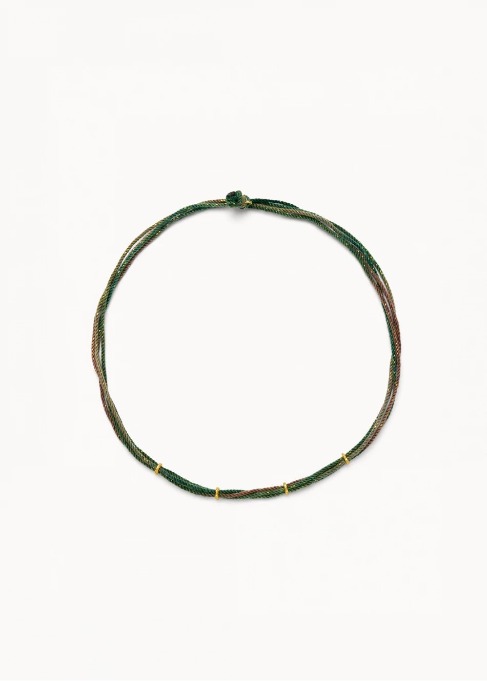 Cuerda en tonos verdosos con variaciones de color que aportan profundidad y movimiento. Detalles dorados que elevan la pieza y aportan luz.
