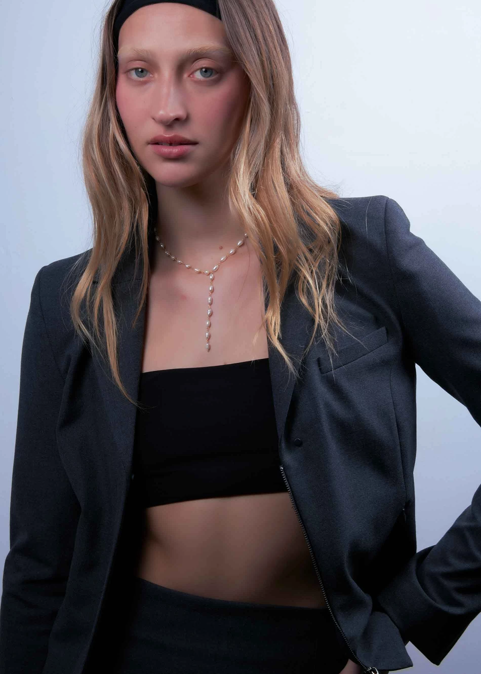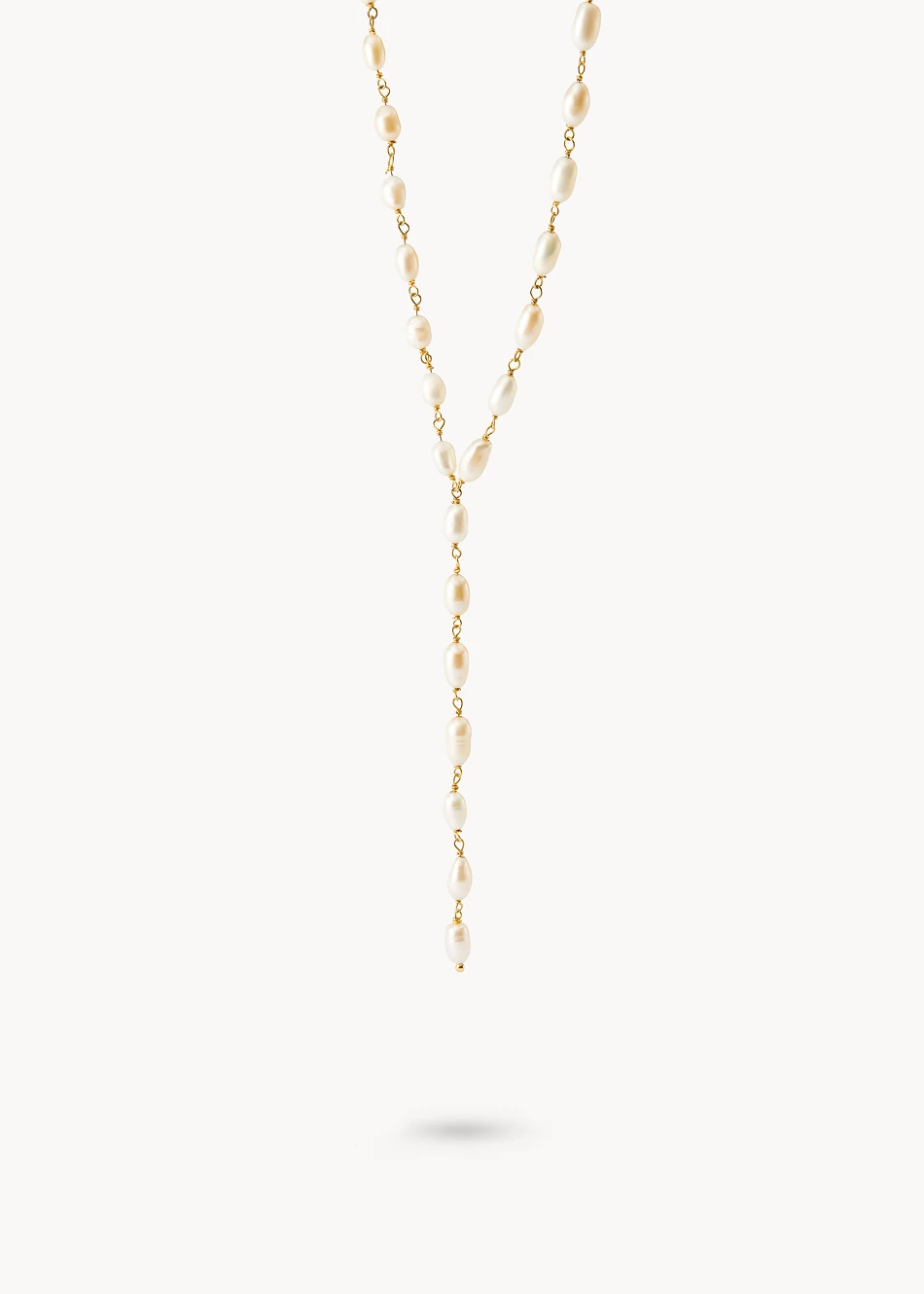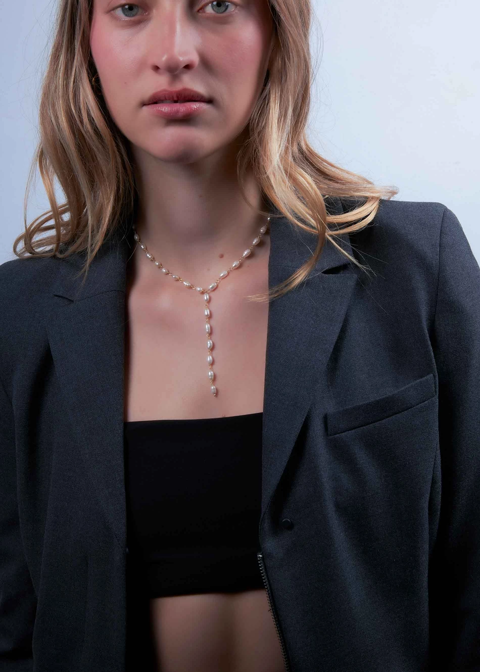 El Collar Drop Pearl es un collar de perlas de 38 cm ampliable hasta 45 cm. De la cadena cuelga una tira de perlas de 7 cm.