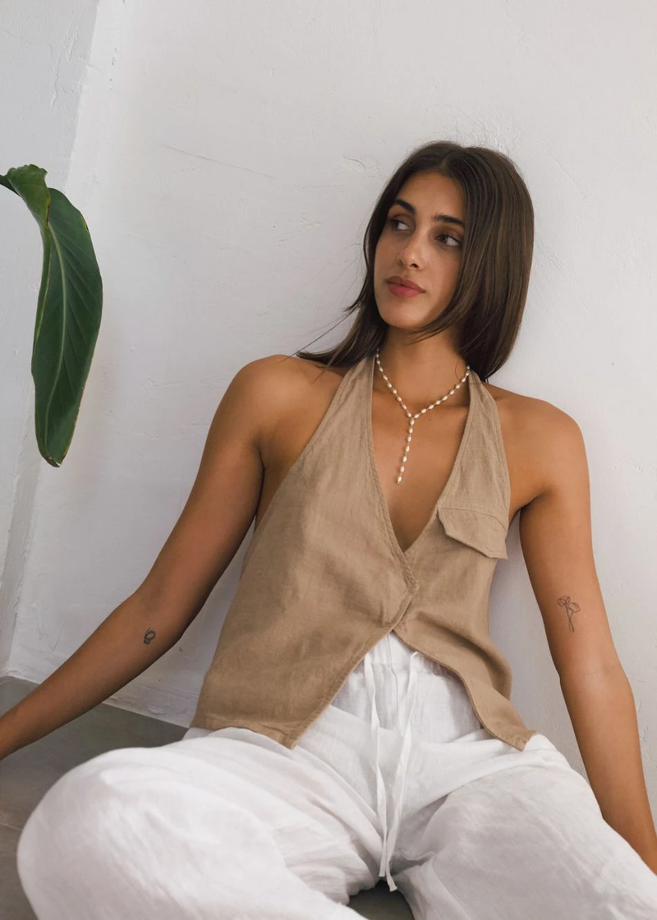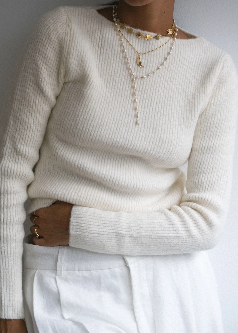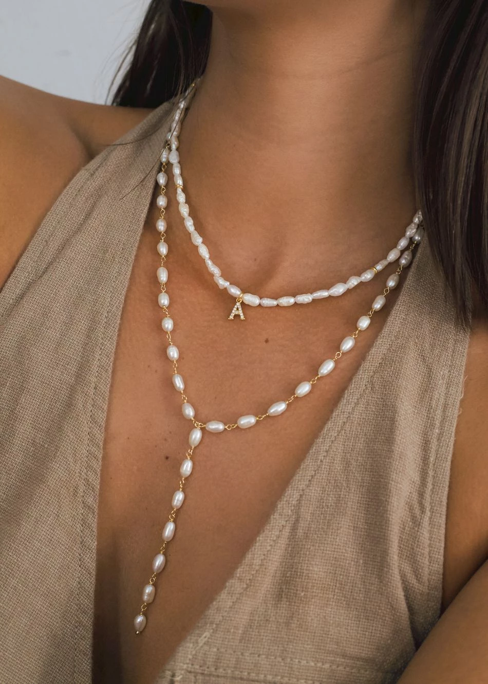 El Collar Drop Pearl es un collar de perlas de 38 cm ampliable hasta 45 cm. De la cadena cuelga una tira de perlas de 7 cm.