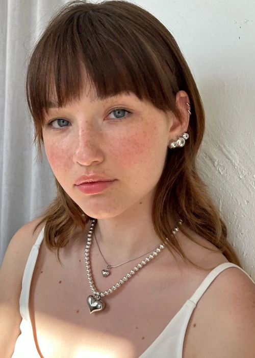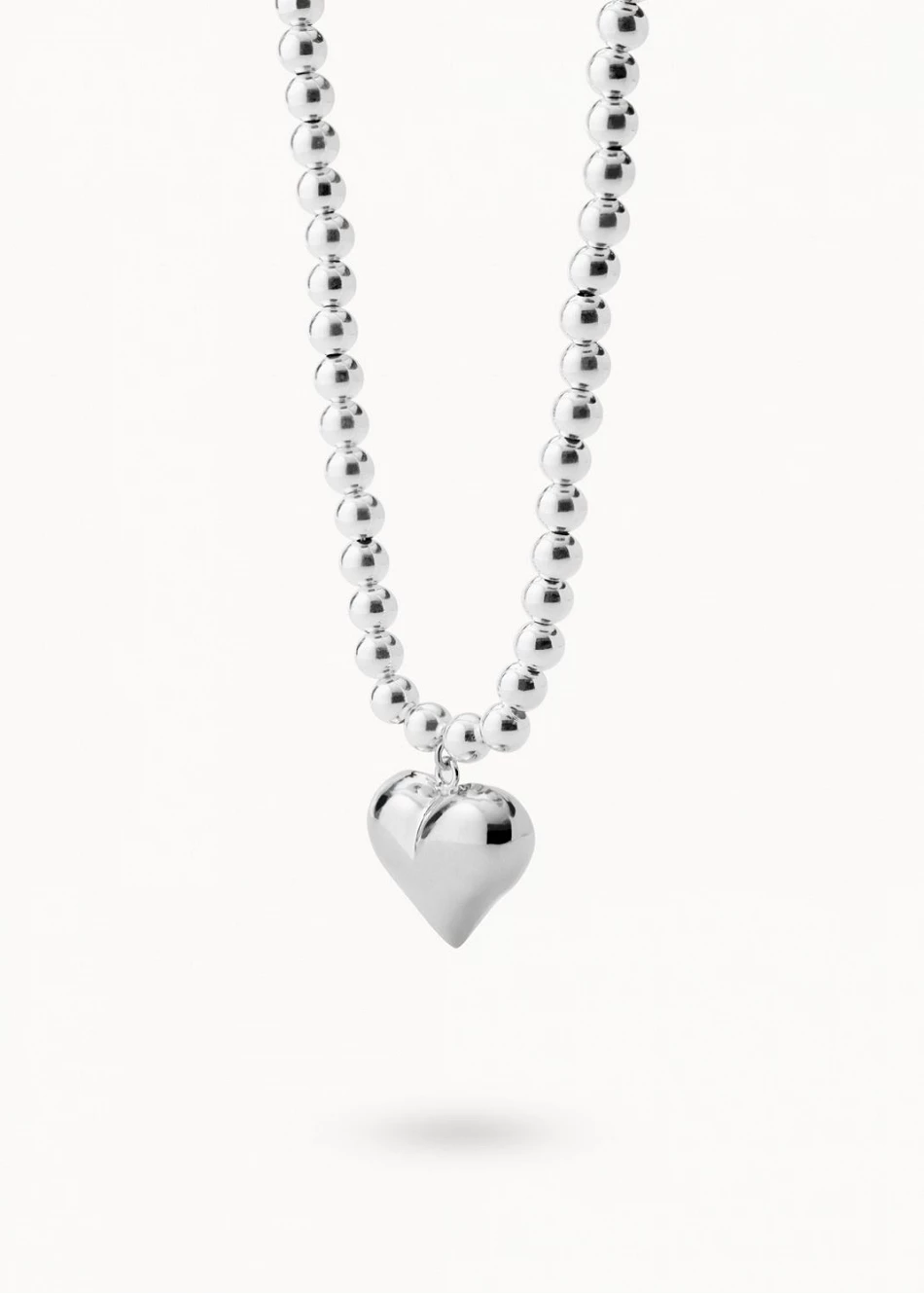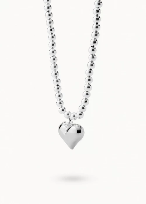 Collar en plata de ley 925 con diseño de bolas y colgante en forma de corazón de 25 x 20 mm. Largo total de 40 cm con extensión adicional de 5 cm. Elegante y versátil, ideal para uso diario.