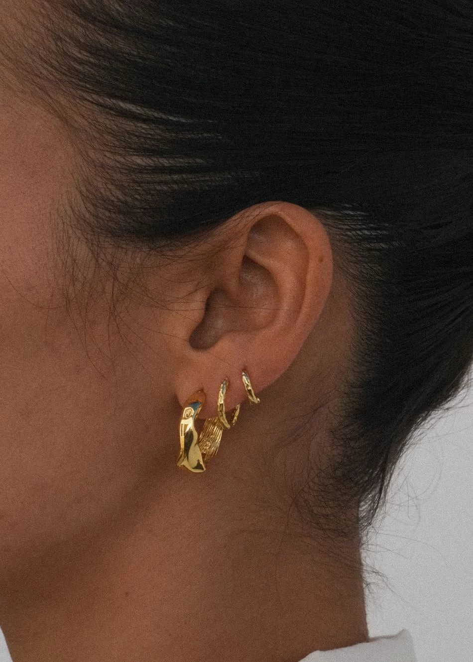 En las imágenes, la modelo lleva el aro de 14 mm en el segundo agujero y el de 10 mm en el tercero, creando una combinación armónica y ligera.